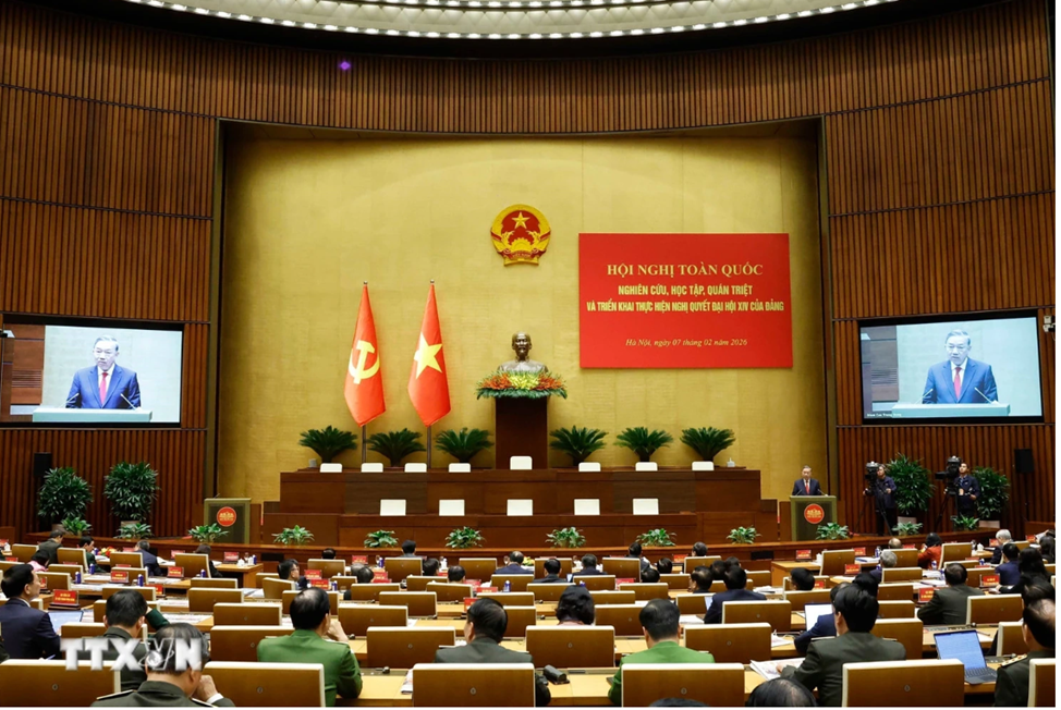 Sáng 7/2/2026, tại Hà Nội, Bộ Chính trị, Ban Bí thư Trung ương Đảng tổ chức Hội nghị toàn quốc nghiên cứu, học tập, quán triệt và triển khai thực hiện Nghị quyết Đại hội XIV của Đảng. Tổng Bí thư Tô Lâm, Chủ tịch nước Lương Cường, Thủ tướng Phạm Minh Chính, Chủ tịch Quốc hội Trần Thanh Mẫn cùng nhiều lãnh đạo, nguyên lãnh đạo Đảng, Nhà nước dự hội nghị. Đây là hội nghị rất quan trọng được tổ chức bằng hình thức trực tiếp từ Hội trường Diên Hồng, Nhà Quốc hội và kết hợp trực tuyến tới 31.097 điểm cầu ở Trung ương, các tỉnh, thành phố, các xã, phường, đặc khu, các tổ chức đảng trong Quân đội, Công an và doanh nghiệp với hơn 1,9 triệu đại biểu tham dự tại các điểm cầu.