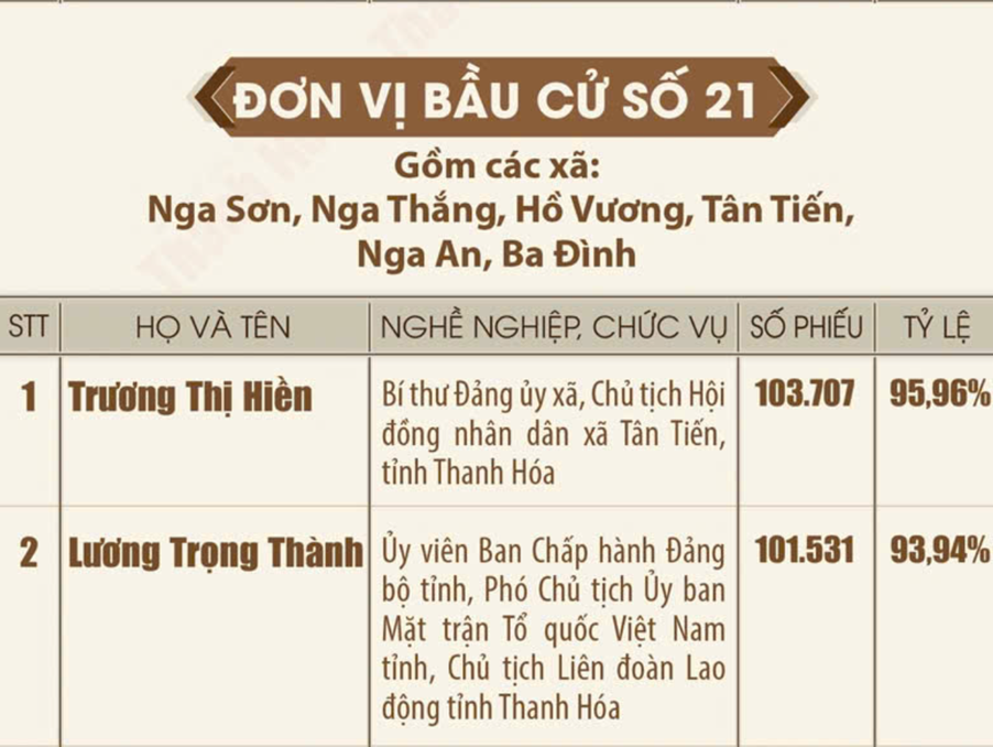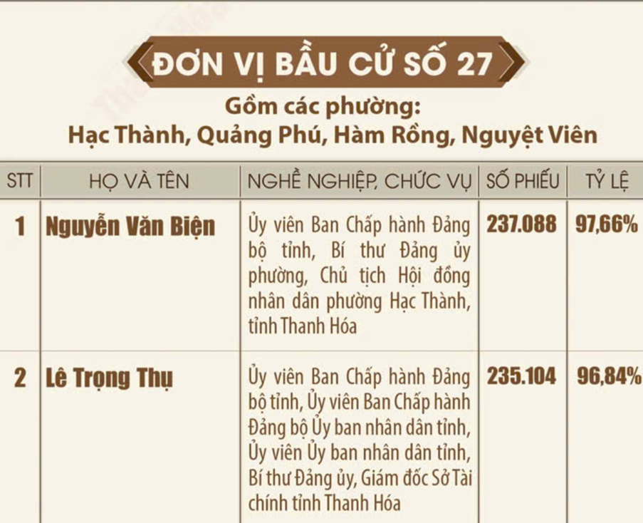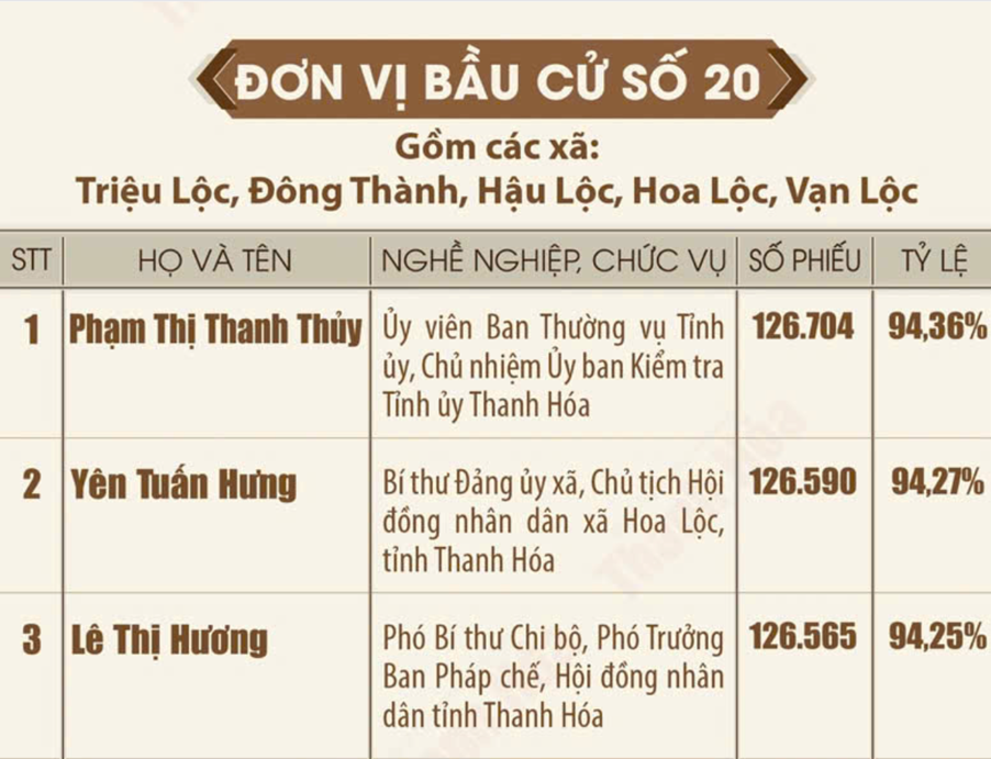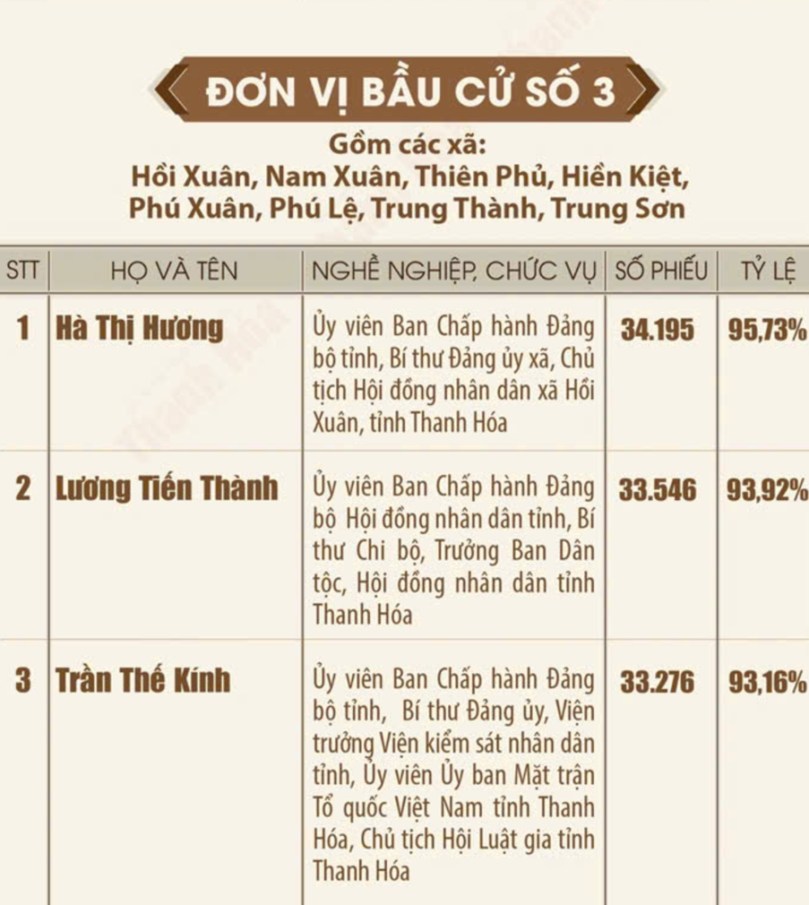 Danh sách những người trúng cử đại biểu Hội đồng nhân dân tỉnh Thanh Hóa khóa XIX, nhiệm kỳ 2026 - 2031 Ngày 18/3/2026, Ủy ban Bầu cử tỉnh Thanh Hóa ban hành Quyết định số 135/QĐ-UBBC công bố danh sách những người trúng cử đại biểu HĐND tỉnh khóa XIX, nhiệm kỳ 2026-2031. Theo đó, toàn tỉnh đã bầu đủ 85 đại biểu HĐND tỉnh, bảo đảm đúng cơ cấu, thành phần và số lượng được ấn định tại các đơn vị bầu cử. Dưới đây là danh sách 85 đại biểu HĐND tỉnh Thanh Hóa khóa XIX: