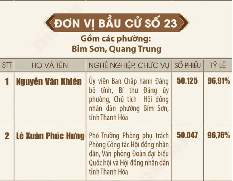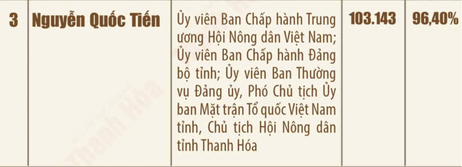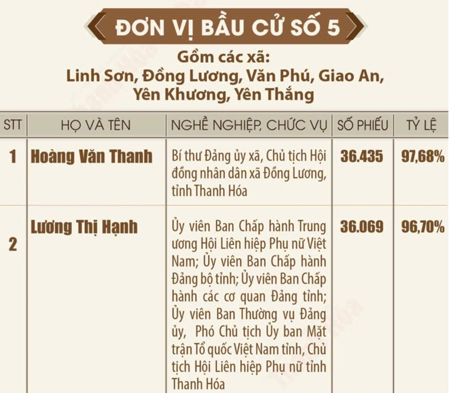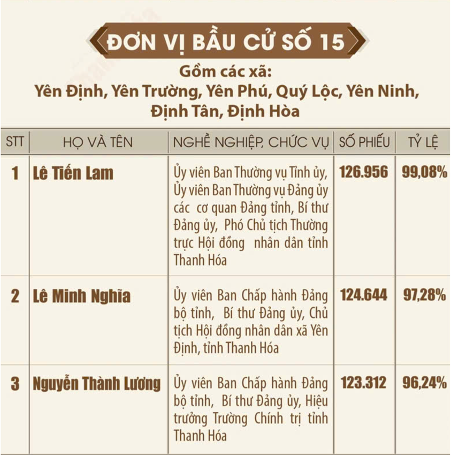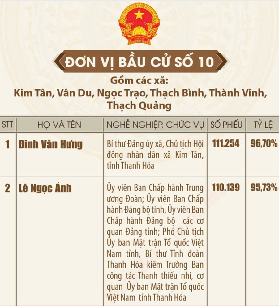 Danh sách những người trúng cử đại biểu Hội đồng nhân dân tỉnh Thanh Hóa khóa XIX, nhiệm kỳ 2026 - 2031 Ngày 18/3/2026, Ủy ban Bầu cử tỉnh Thanh Hóa ban hành Quyết định số 135/QĐ-UBBC công bố danh sách những người trúng cử đại biểu HĐND tỉnh khóa XIX, nhiệm kỳ 2026-2031. Theo đó, toàn tỉnh đã bầu đủ 85 đại biểu HĐND tỉnh, bảo đảm đúng cơ cấu, thành phần và số lượng được ấn định tại các đơn vị bầu cử. Dưới đây là danh sách 85 đại biểu HĐND tỉnh Thanh Hóa khóa XIX: