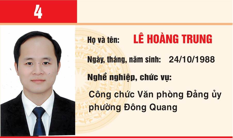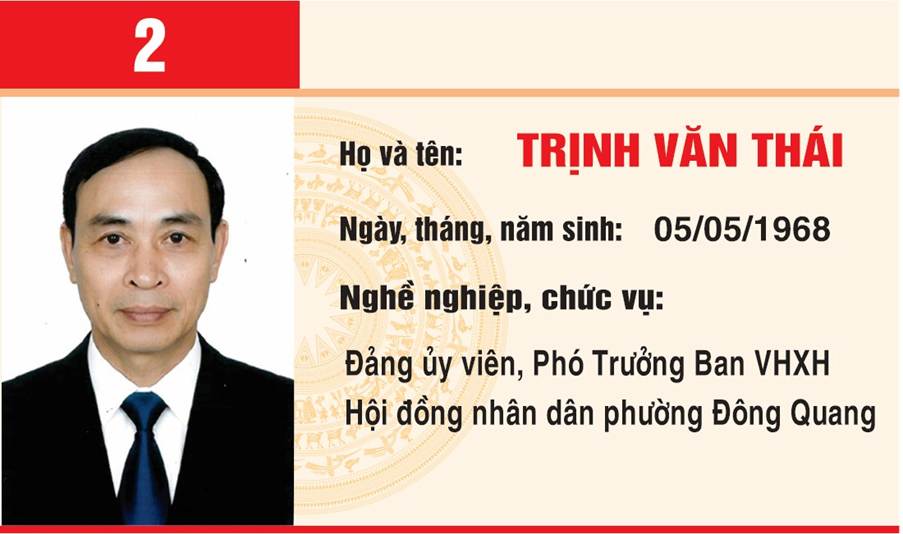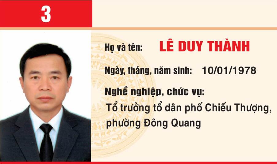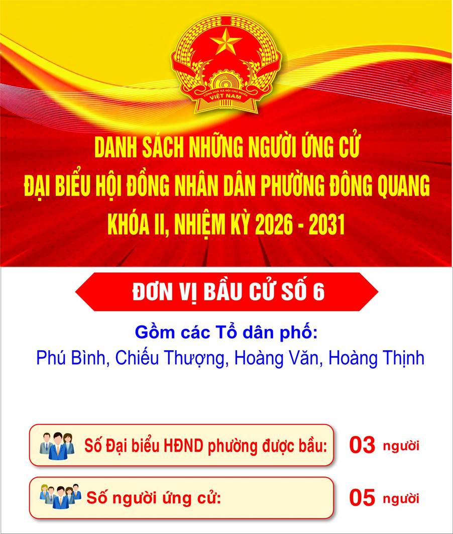 Ủy ban bầu cử phường Đông Quang trân trọng giới thiệu các ứng cử viên đại biểu Hội đồng nhân dân phường Đông Quang khóa II, nhiệm kỳ 2026-2031, thuộc đơn vị bầu cử số 6 phường Đông Quang, tỉnh Thanh Hóa.