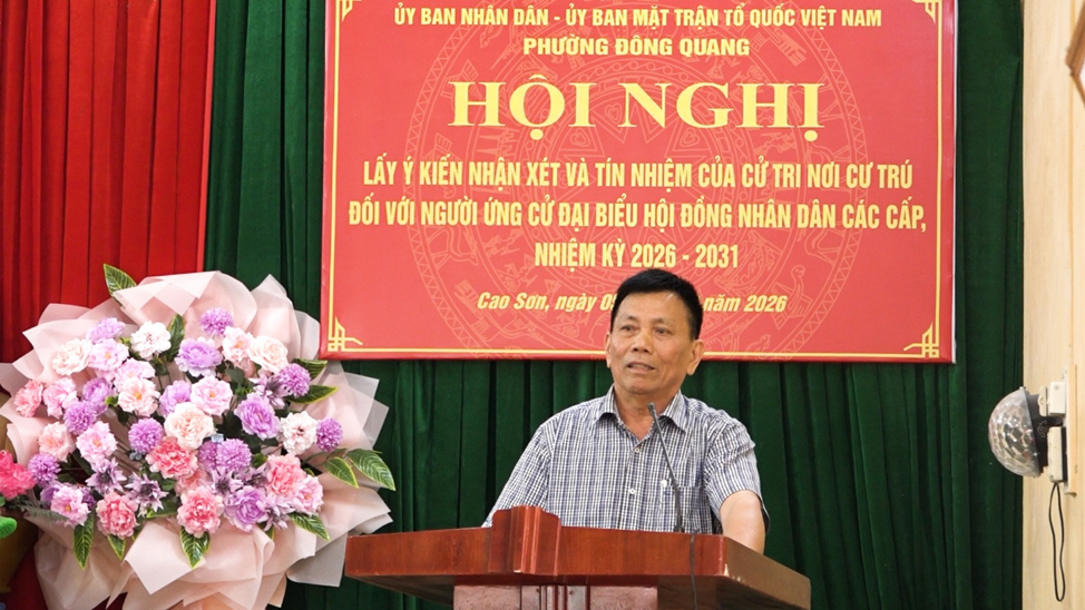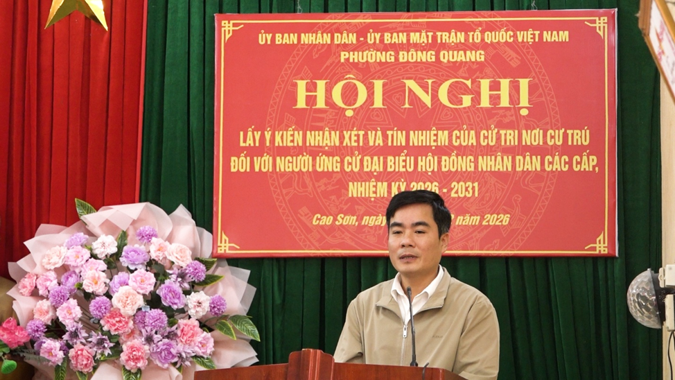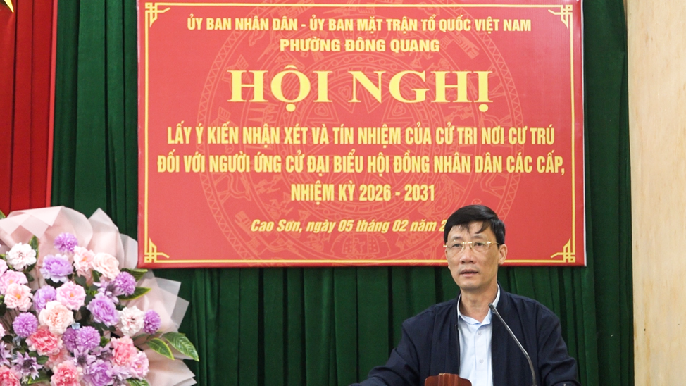 Sáng 5/22026, tại Tổ dân phố Cao Sơn phường Đông Quang, Ủy ban MTTQ phường tổ chức hội nghị lấy ý kiến nhận xét và tín nhiệm của cử tri nơi cư trú đối với 29 người ứng cử đại biểu HĐND các cấp, nhiệm kỳ 2026-2031.